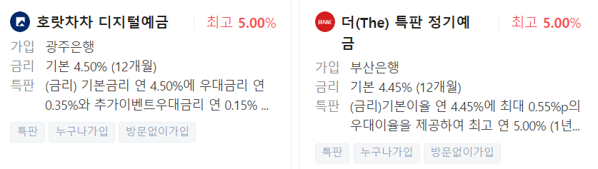 지금은 광주은행과 부산은행이 특판상품을 판매 중이며 최고 5.00%의 금리를 제시하고 있습니다.