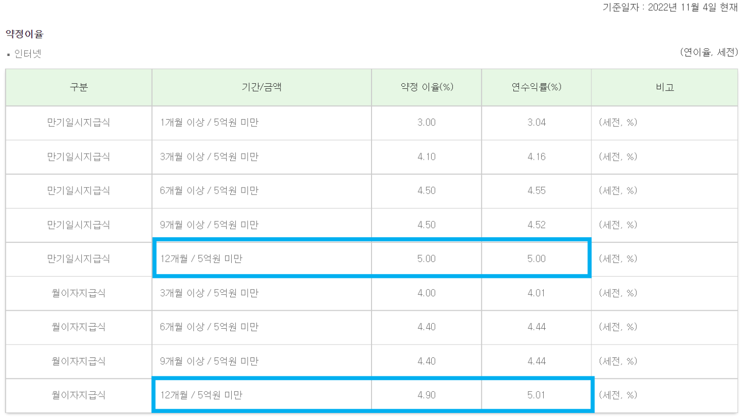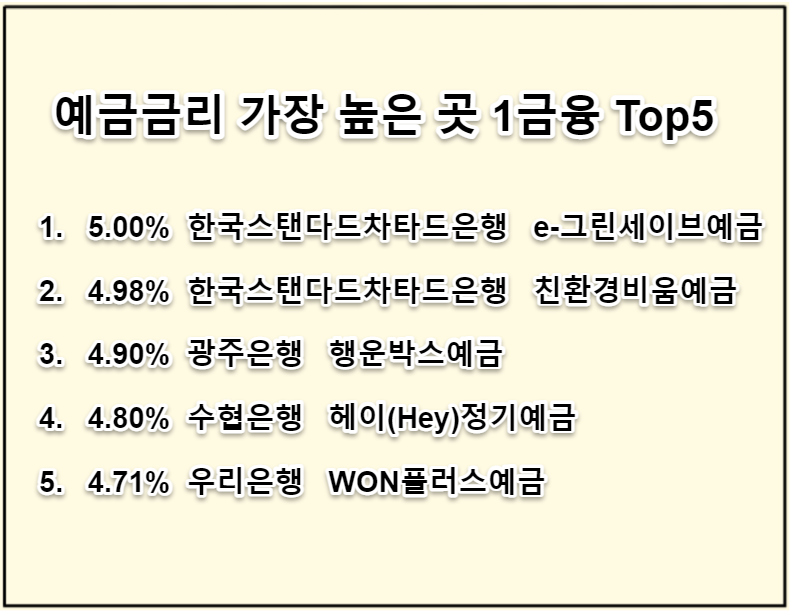 SC제일은행(한국스탠다드차타드은행)의 e-그린세이브예금은 현재 제1금융권 정기예금금리 가장 높은 곳이며 보너스 이율 0.1%를 추가하면 5.10%가 최고 금리입니다.